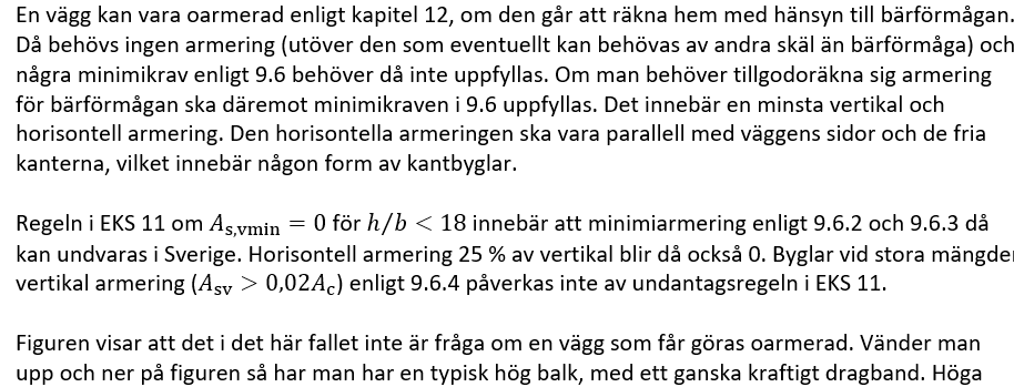 Fråga: Jag undrar över om man behöver byglar för de fria kanterna för en "oarmerad" vägg där man har armering även om den inte är nödvändig med hänsyn till bärförmågan? Enligt 9.6.3 (1) anges det att man ska ha As,hmin på alla ytor och med de fria kanterna. Enligt EKS 11 9.6.2(1) finns ingen undra gräns för Asv,min för väggar med h/b mindre än 18, dock ska man alltid använda 25 % av den vertikala armering enligt EKS11 9.6.3(1). Bör man då lägga in byglar vid de fria kanterna och varför?