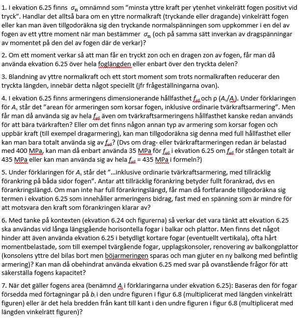 Fråga: Min fråga gäller tvärkraftsbrottmoden hävstångsbrott i betong, kapitel 7.2.2.4. För brottmoderna betongkonsbrott (7.21.4) och betongkantbrott (7.2.2.5) ges möjlighet att höja bärförmågan genom att lägga in kompletterande armering. Kontroll av betongen utgår då och ersätts av kontroller av den kompletterande armeringen. Ingen sådan möjlighet att armera mot brottmoden verkar finnas för hävstångsbrott i betong. Bärförmågan reduceras i stället vid förekomst av armering. Dels genom faktorn 0,75 i ekvation 7.39b vid förekomst av kompletterande armering och dels möjligen vid förekomst av ytarmering genom faktorn Ψre,N i beräkningen av NRk,c. Är detta rätt uppfattat? Och är det i så fall inte märkligt att bärförmågan med hänsyn till hävstångsbrott i betong beror av bärförmågan med hänsyn till betongkonsbrott, men att armering som i praktiken höjer bärförmågan med hänsyn till betongkonsbrott sänker bärförmågan med hänsyn till hävstångsbrott i betong? Är det möjligt att NRk,c.i ekv. 7.39b egentligen skulle ersättas med en bärförmåga relaterad till den kompletterande armeringen? Borde inte armering rätvinkligt mot ytan höja bärförmågan? Den höjer ju i praktiken bärförmågan med hänsyn till betongkonsbrott, och bärförmågan med hänsyn till hävstångsbrott i betong är ju beroende av denna.