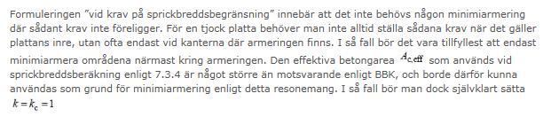 3- Om jag förstår Eurokod rätt så gäller avsnitt 7.3.1 gäller allmänt. Detta betyder att man pratar inte speciellt om spännbetong eller nåt annat. Min fråga är varför meningen ” Om dragspänningen inte överstiger fctk/ζ kan betongen anses vara osprucken.” ligger under stycke 7.3.1(5) om detta gäller endast för spännbetong. Det är väldigt många konstruktörer som använder sprickkriteriet med svensk tillämpning fctk/ζ för slakarmerad betong bara på grund av den meningen.