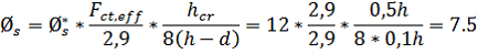 Om det finns krav på sprickbreddsbegränsning bör tillsvidare minimiarmeringsvillkoret (7.1) tillämpas med en begränsad spänning enligt tabell 7.2N. I så fall är det viktigt att justera stångdiametern enligt ekv (7.7N). I ekv (7.7N) ska för övrigt ingå en faktor k1 = 0,8 i täljaren. För att få fram aktuell spänning ska omräkningen tillämpas "baklänges", dvs man går in i tabellen med ett omräknat f*.